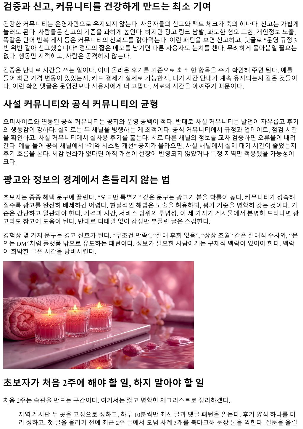 검증과신고, 커뮤니티를건강하게만드는최소기여 건강한커뮤니티는운영자만으로유지되지않는다. 사용자들의신고와팩트체크가축의하나다. 신고는가볍게 눌러도된다. 사람들은신고의기준을과하게높인다. 하지만광고링크남발, 과도한혐오표현, 개인정보노출, 똑같은단어반복게시등은커뮤니티의신뢰도를갉아먹는다. 이런패턴을보면신고하고, 댓글로 “운영규정 3 번위반같아신고했습니다” 정도의짧은메모를남기면다른사용자도눈치를챈다. 무례하게몰아붙일필요는 없다. 행동만지적하고, 사람은공격하지않는다. 검증은반대로시간을쓰는일이다. 이미올라온후기를기준으로최소한항목을추가확인해주면된다. 예를 들어최근가격변동이있었는지, 카드결제가실제로가능한지, 대기시간안내가계속유지되는지같은것들이 다. 이런확인댓글은운영진보다사용자에게더고맙다. 서로의시간을아껴주기때문이다. 사설커뮤니티와공식커뮤니티의균형 오피사이트와연동된공식커뮤니티는공지와운영공백이적다. 반대로사설커뮤니티는발언이자유롭고후기 의생동감이강하다. 실제로는두채널을병행하는게최적이다. 공식커뮤니티에서규정과업데이트, 점검시간 을확인하고, 사설커뮤니티에서실사용후기를훑는다. 서로다른채널의정보를교차검증하면오류율이내려 간다. 예를들어공식채널에서 “예약시스템개선” 공지가올라오면, 사설채널에서실제대기시간이줄었는지 후기흐름을본다. 체감변화가없다면아직개선이현장에반영되지않았거나특정지역만적용됐을가능성이 크다. 광고와정보의경계에서흔들리지않는법 초보자는종종혜택문구에끌린다. “오늘만특별가” 같은문구는광고가붙을확률이높다. 커뮤니티가성숙해 질수록광고를완전히배제하긴어렵다. 현실적인해법은노출을허용하되, 평가기준을명확히갖는것이다. 기 준은간단하고일관돼야한다. 가격과시간, 서비스범위의투명성. 이세가지가게시물에서분명히드러나면광 고라도참고에도움이된다. 반대로디테일없이감정만부풀린글은스킵한다. 경험상몇가지문구는경고신호가된다. “무조건만족”, “절대후회없음”, “상상초월” 같은절대적수사와, “문 의는 DM”처럼플랫폼밖으로유도하는패턴이다. 정보가필요한사람에게는구체적맥락이있어야한다. 맥락 이희박한글은시간을낭비시킨다. 초보자가처음 2주에해야할일, 하지말아야할일 처음 2주는습관을만드는구간이다. 여기서는짧고명확한체크리스트로정리하겠다. 지역게시판두곳을고정으로정하고, 하루 10분씩만최신글과댓글패턴을읽는다. 후기양식하나를미 리정하고, 첫글을올리기전에최근 2주글에서모범사례 3개를북마크해문장톤을익힌다. 질문을올릴