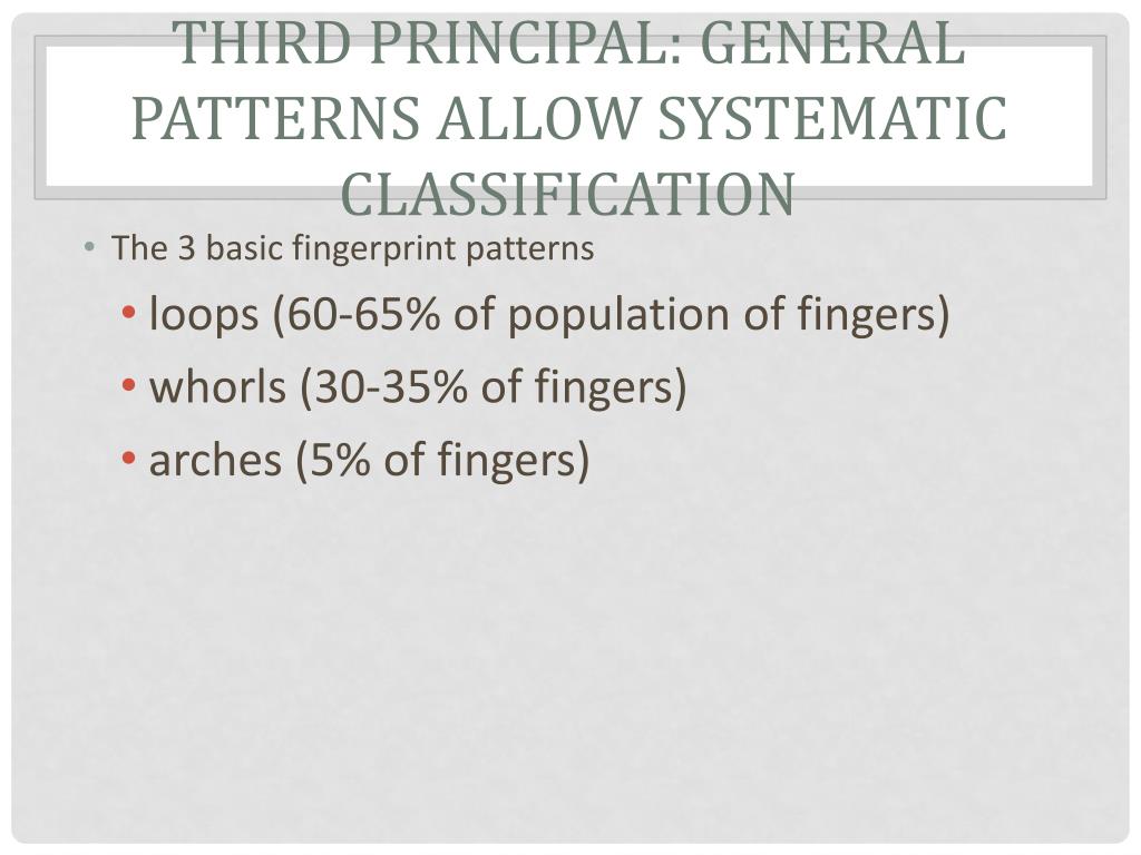 Third Principal: General Patterns allow systematic classification • The 3 basic fingerprint patterns • loops (60-65% of population of fingers) • whorls (30-35% of fingers) • arches (5% of fingers)