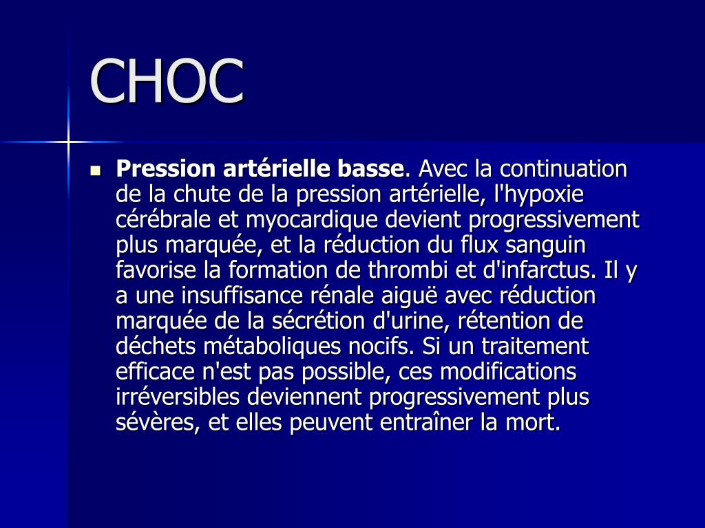 CHOC • Pression artérielle basse. Avec la continuation de la chute de la pression artérielle, l'hypoxie cérébrale et myocardique devient progressivement plus marquée, et la réduction du flux sanguin favorise la formation de thrombi et d'infarctus. Il y a une insuffisance rénale aiguë avec réduction marquée de la sécrétion d'urine, rétention de déchets métaboliques nocifs. Si un traitement efficace n'est pas possible, ces modifications irréversibles deviennent progressivement plus sévères, et elles peuvent entraîner la mort.