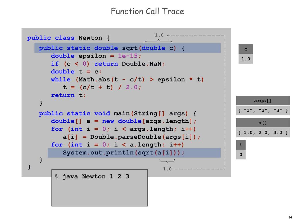 Function Call Trace publicclass Newton { public staticdouble sqrt(double c) { double epsilon =1e-15; if (c < 0) return Double.NaN; double t = c; while(Math.abs(t - c/t)> epsilon * t) t =(c/t + t)/2.0; return t; } public static void main(String[] args) { double[] a = new double[args.length]; for (int i = 0; i < args.length; i++) a[i] = Double.parseDouble(args[i]); for (int i = 0; i < a.length; i++) System.out.println(sqrt(a[i])); } } c 3.0 args[] 1.7320508075688772 { "1", "2", "3" } a[] { 1.0, 2.0, 3.0 } i 2 1.7320508075688772 % java Newton 1 2 3 1.0 1.414213562373095