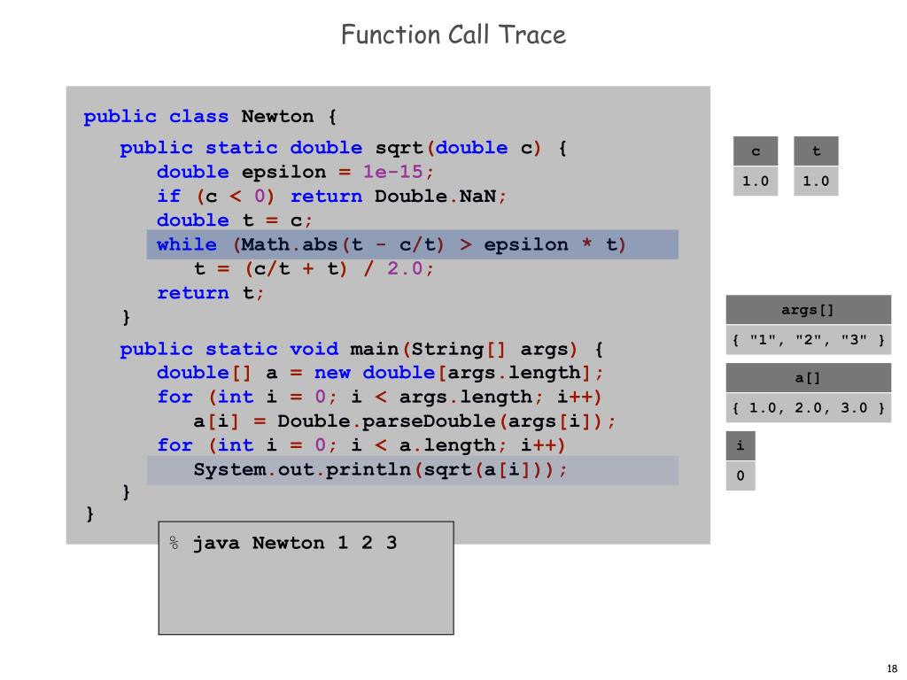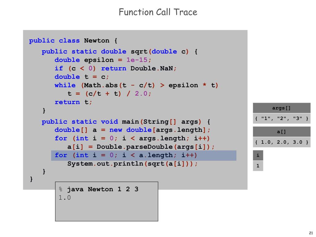 Function Call Trace publicclass Newton { public staticdouble sqrt(double c) { double epsilon =1e-15; if (c < 0) return Double.NaN; double t = c; while(Math.abs(t - c/t)> epsilon * t) t =(c/t + t)/2.0; return t; } public static void main(String[] args) { double[] a = new double[args.length]; for (int i = 0; i < args.length; i++) a[i] = Double.parseDouble(args[i]); for (int i = 0; i < a.length; i++) System.out.println(sqrt(a[i])); } } args[] { "1", "2", "3" } a[] { 1.0, 2.0, 3.0 } i 3 goes outof scope % java Newton 1 2 3