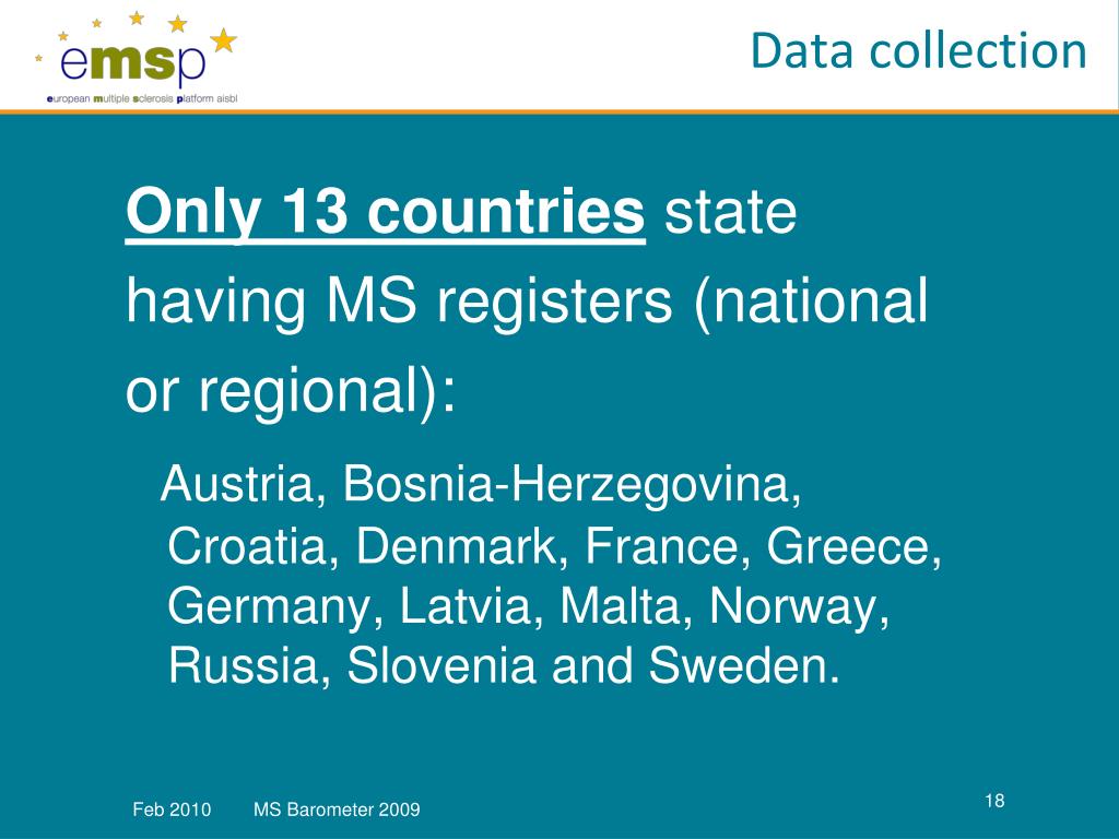 Data collection Only 13 countriesstate having MS registers (national or regional): Austria, Bosnia-Herzegovina, Croatia, Denmark, France, Greece, Germany, Latvia, Malta, Norway, Russia, Sloveniaand Sweden.
