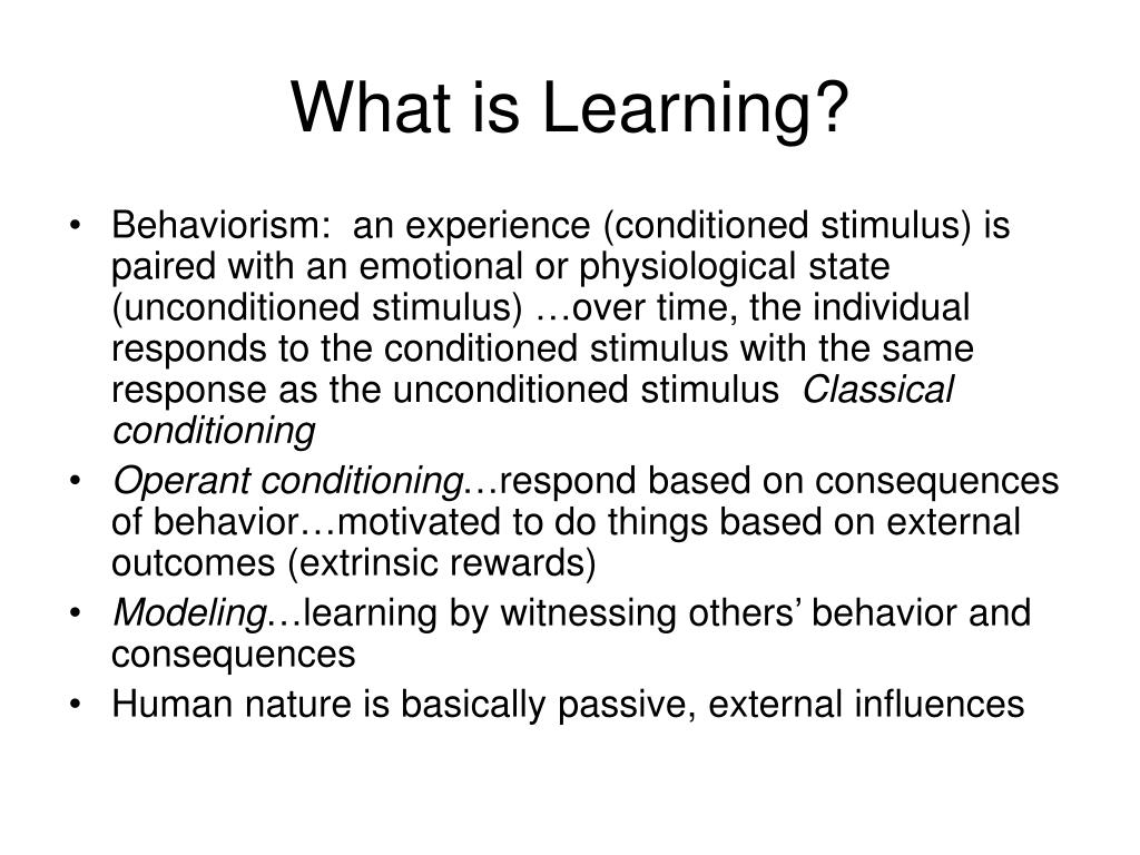 What is Learning? • Behaviorism: an experience (conditioned stimulus) is paired with an emotional or physiological state (unconditioned stimulus) …over time, the individual responds to the conditioned stimulus with the same response as the unconditioned stimulus Classical conditioning • Operant conditioning…respond based on consequences of behavior…motivated to do things based on external outcomes (extrinsic rewards) • Modeling…learning by witnessing others’ behavior and consequences • Human nature is basically passive, external influences