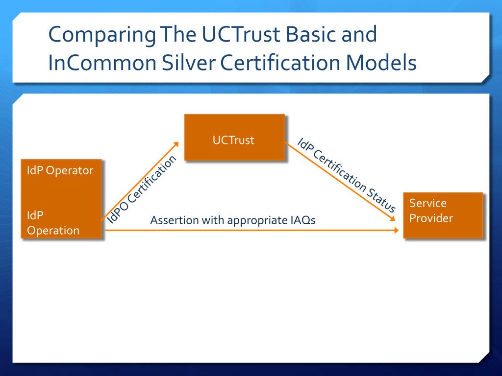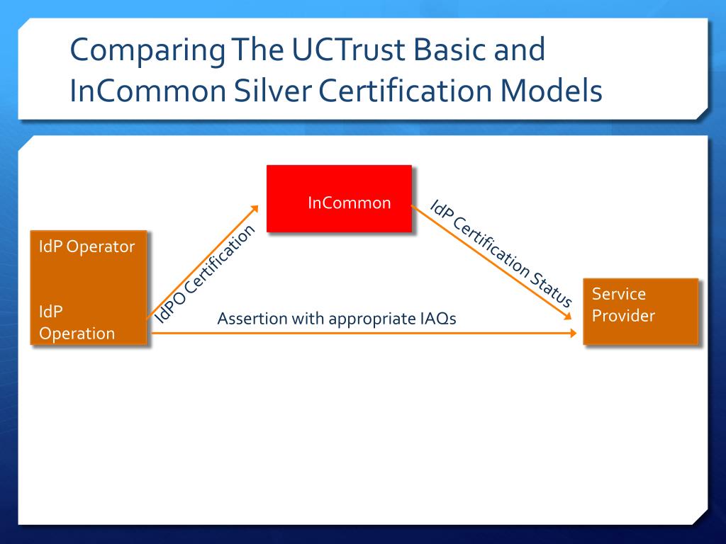 Comparing The UCTrust Basic and InCommon Silver Certification Models UCTrust IdP Operator IdP Operation IdP Certification Status IdPO Certification Service Provider Assertion with appropriate IAQs