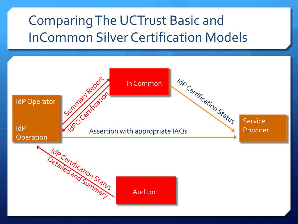 Comparing The UCTrust Basic and InCommon Silver Certification Models InCommon IdP Operator IdP Operation IdP Certification Status IdPO Certification Service Provider Assertion with appropriate IAQs