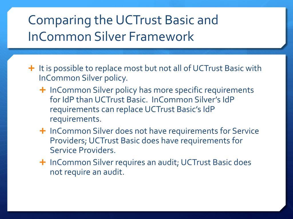 Comparing the UCTrust Basic and InCommon Silver Framework • It is possible to replace most but not all of UCTrust Basic with InCommon Silver policy. • InCommon Silver policy has more specific requirements for IdP than UCTrust Basic. InCommon Silver’s IdP requirements can replace UCTrust Basic’s IdP requirements. • InCommon Silver does not have requirements for Service Providers; UCTrust Basic does have requirements for Service Providers. • InCommon Silver requires an audit; UCTrust Basic does not require an audit.