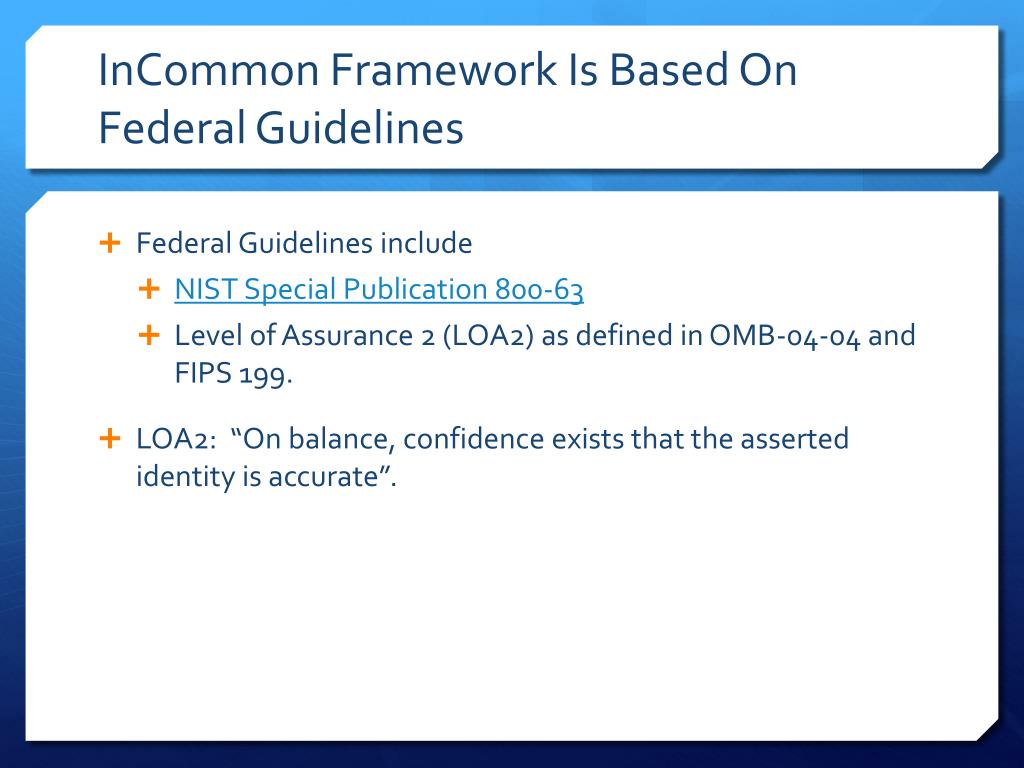 InCommon Framework Is Based On Federal Guidelines • Federal Guidelines include • NIST Special Publication 800-63 • Level of Assurance 2 (LOA2) as defined in OMB-04-04 and FIPS 199. • LOA2: “On balance, confidence exists that the asserted identity is accurate”.