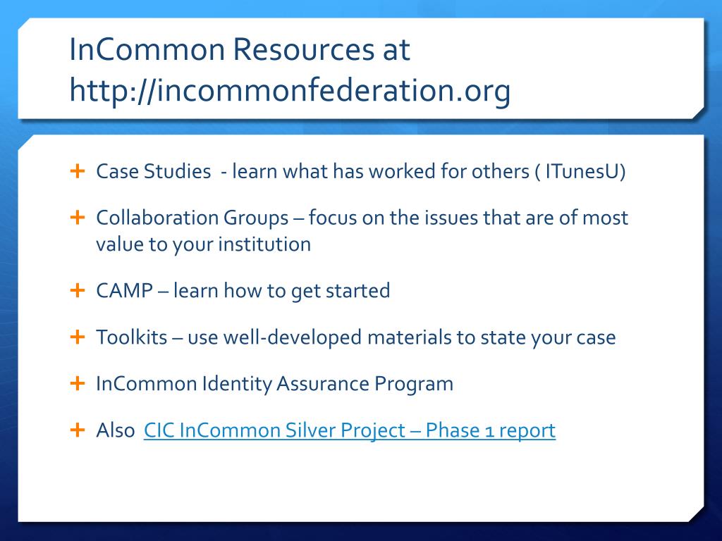 InCommon Resources at http://incommonfederation.org • Case Studies - learn what has worked for others ( ITunesU) • Collaboration Groups – focus on the issues that are of most value to your institution • CAMP – learn how to get started • Toolkits – use well-developed materials to state your case • InCommon Identity Assurance Program • Also CIC InCommon Silver Project – Phase 1 report
