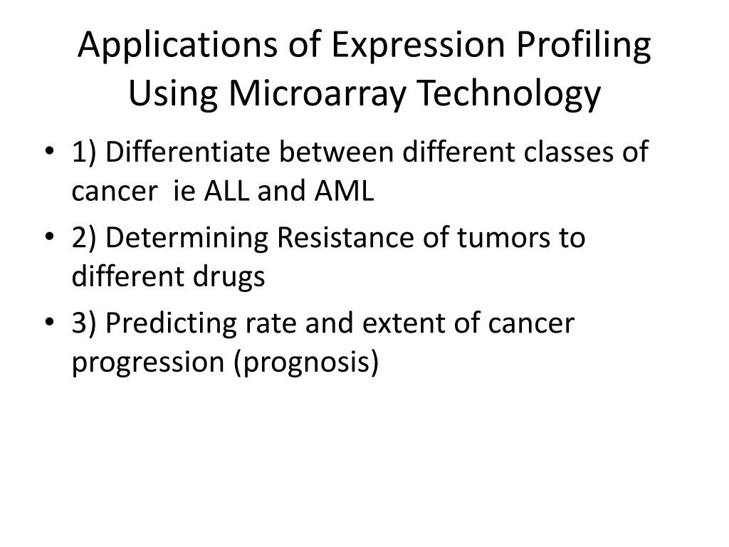 Applications of Expression Profiling Using Microarray Technology • 1) Differentiate between different classes of cancer ie ALL and AML • 2) Determining Resistance of tumors to different drugs • 3) Predicting rate and extent of cancer progression (prognosis)