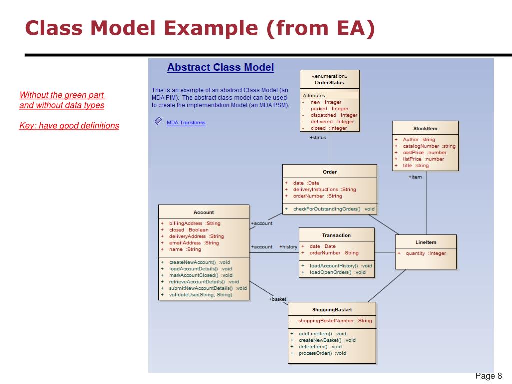 Class Model Example (from EA) Without the green part and without data types Key: have good definitions