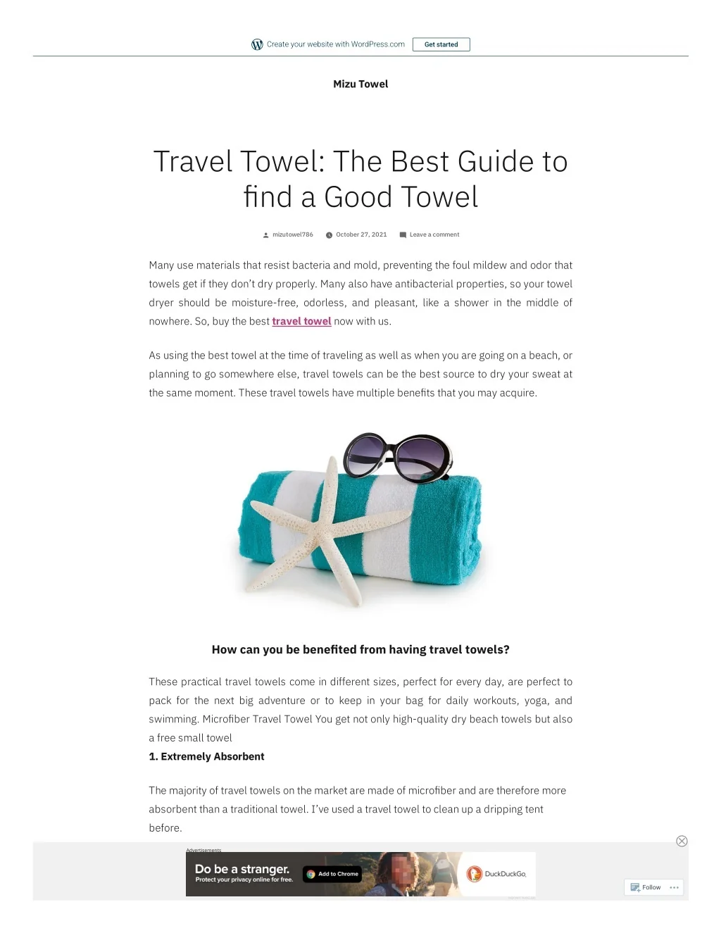 Nothing is worse than smelling like a wet towel in your car or tent. Travel towels are made of materials that allow them to dry faster than regular towels 3. Save Space Create your website with WordPress.com Get started The travel towels don’t take more space to get stored. They can easily roll or fold into a small space, some as small as a tin of beans. 4. Comfortable Micro?ber towels are as soft, if not more so than traditional towels in my opinion. It will also keep its softness in the wash, eliminating the need for fabric softener. Some will even soften in the wash with time. 5. Long-Lasting My favorite towel has been in my possession for over a decade and has not faded or frayed at the edges despite constant use. Why Buy a Travel Towel? The travel towel set is available in small (40 / 20) and medium (48 / 24) sizes and is known as the best towel for backpacks because it is lightweight, fast-drying, and suitable for numerous applications. Put it in your travel pants or backpack bag, pull it out for showering or training, or dry your camping gear and watch as you dry it while hanging it on its loop. Travel towels, are thin, soft, compact, and super absorbent, making them the perfect shower towel after exercise with their unique, non-abrasive feel. They absorb three to four times their weight and dry ten times faster than normal cotton towels. Conclusion The best option for towel-related scenarios is the Personal travel towel, which is light, large, and super soft, making it suitable for car camping and backcountry travel. Their drying time is faster than most of the towels we have tested, and they can be packed in a Advertisements Follow REPORT THIS AD
