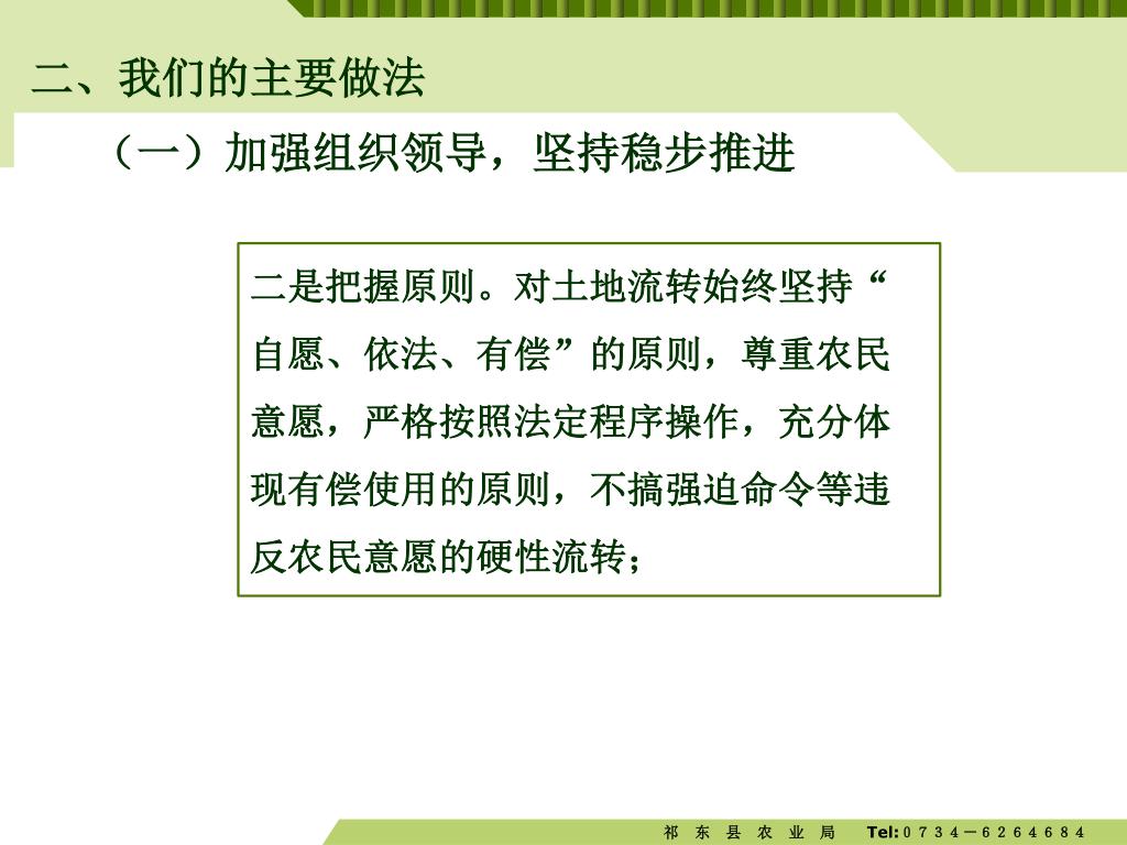 二、我们的主要做法 (一)加强组织领导,坚持稳步推进 二是把握原则。对土地流转始终坚持“自愿、依法、有偿”的原则,尊重农民意愿,严格按照法定程序操作,充分体现有偿使用的原则,不搞强迫命令等违反农民意愿的硬性流转;