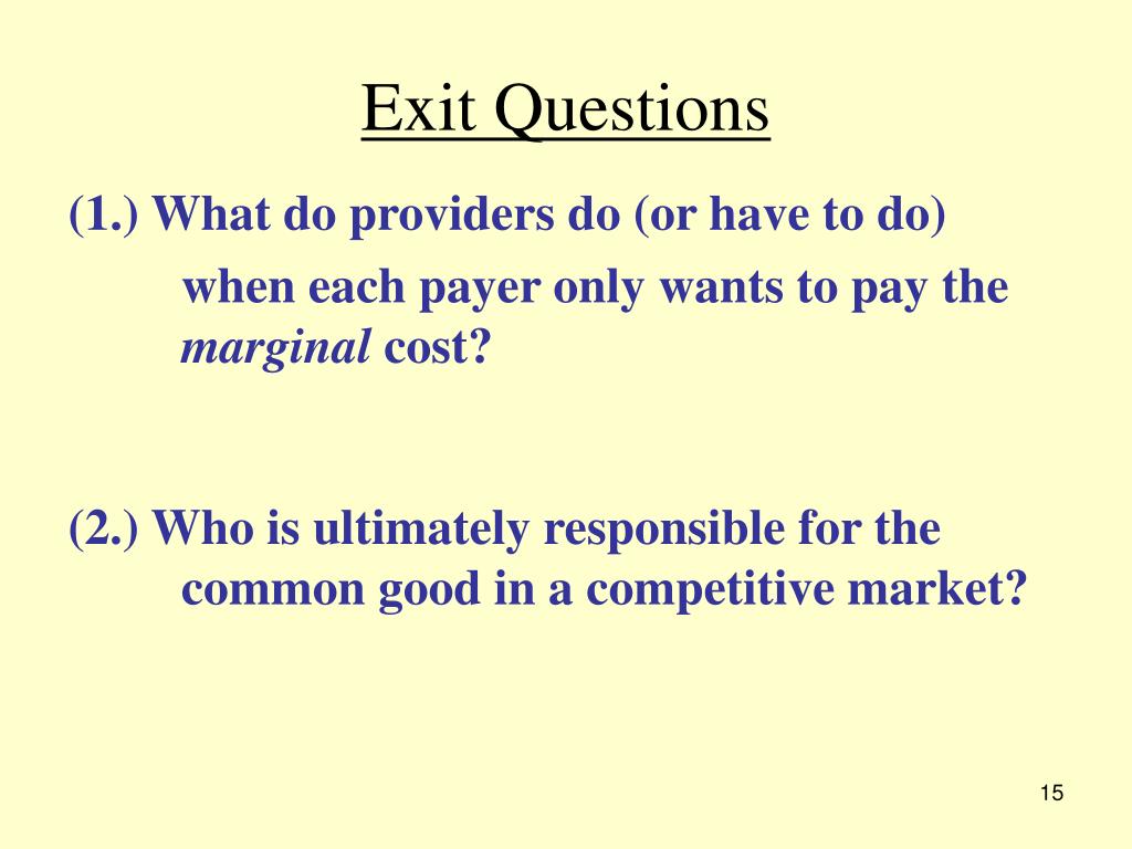 Exit Questions (1.) What do providers do (or have to do) when each payer only wants to pay the marginal cost? (2.) Who is ultimately responsible for the common good in a competitive market?
