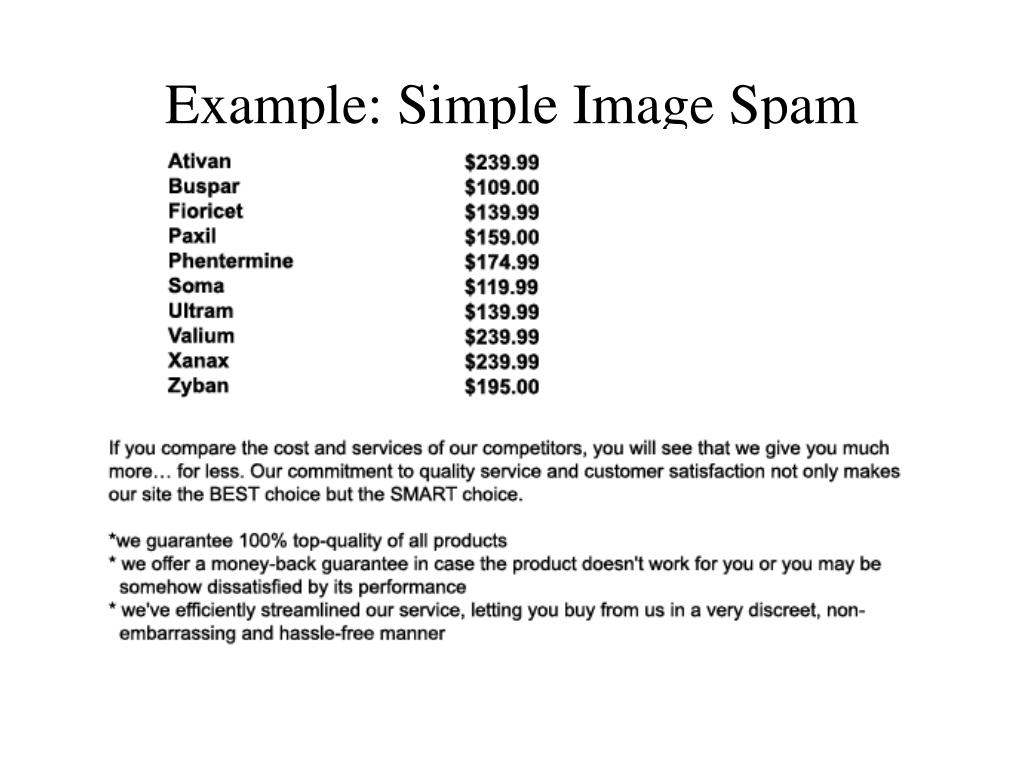 Image Spam • Spammers currently like image spam because… • Text based filters are getting really good • Hard to read the text in an image • URL blacklists are catching a lot of spam • Recipient is usually asked to type in a URL in the image • Hard to automatically extract that URL for blacklisting • An image is hard for a machine to interpret • Lots of latitude for obscuring the image