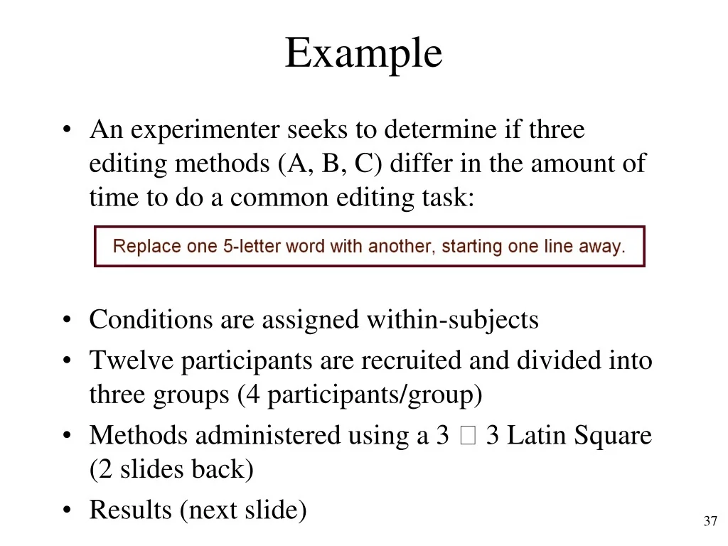 Example • An experimenter seeks to determine if three editing methods (A, B, C) differ in the amount of time to do a common editing task: • Conditions are assigned within-subjects • Twelve participants are recruited and divided into three groups (4 participants/group) • Methods administered using a 3 3 Latin Square (2 slides back) • Results (next slide)