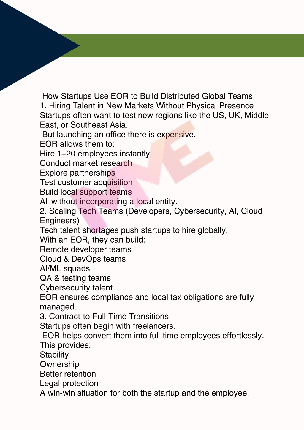 How Startups Use EOR to Build Distributed Global Teams 1. Hiring Talent in New Markets Without Physical Presence Startups often want to test new regions like the US, UK, Middle East, or Southeast Asia. But launching an office there is expensive. EOR allows them to: Hire 1–20 employees instantly Conduct market research Explore partnerships Test customer acquisition Build local support teams All without incorporating a local entity. 2. Scaling Tech Teams (Developers, Cybersecurity, AI, Cloud Engineers) Tech talent shortages push startups to hire globally. With an EOR, they can build: Remote developer teams Cloud & DevOps teams AI/ML squads QA & testing teams Cybersecurity talent EOR ensures compliance and local tax obligations are fully managed. 3. Contract-to-Full-Time Transitions Startups often begin with freelancers. EOR helps convert them into full-time employees effortlessly. This provides: Stability Ownership Better retention Legal protection A win-win situation for both the startup and the employee.