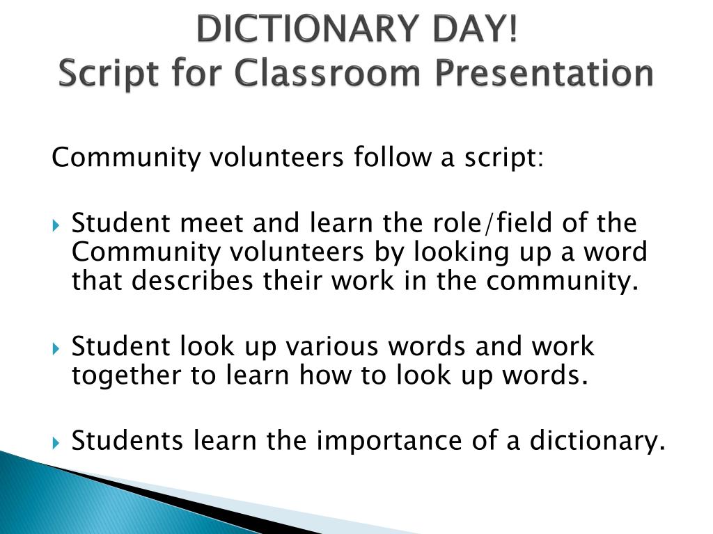 DICTIONARY DAY!Script for Classroom Presentation Community volunteers follow a script: • Student meet and learn the role/field of the Community volunteers by looking up a word that describes their work in the community. • Student look up various words and work together to learn how to look up words. • Students learn the importance of a dictionary.