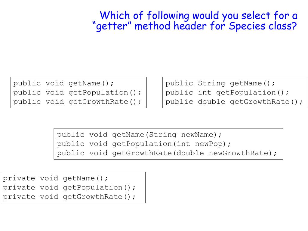Which of following would you select for a “getter” method header for Species class? public void getName(); public void getPopulation(); public void getGrowthRate(); public String getName(); public intgetPopulation(); public double getGrowthRate(); public void getName(String newName); public void getPopulation(intnewPop); public void getGrowthRate(double newGrowthRate); private void getName(); private void getPopulation(); private void getGrowthRate();