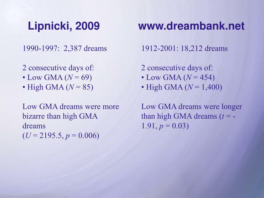 www.dreambank.net • 1912-2001: 18,212 dreams • 2 consecutive days of: • Low GMA (N = 454) • High GMA (N = 1,400) • Low GMA dreams were longer than high GMA dreams (t = -1.91, p = 0.03) Lipnicki, 2009 • 1990-1997: 2,387 dreams • 2 consecutive days of: • Low GMA (N = 69) • High GMA (N = 85) • Low GMA dreams were more bizarre than high GMA dreams • (U = 2195.5, p = 0.006)