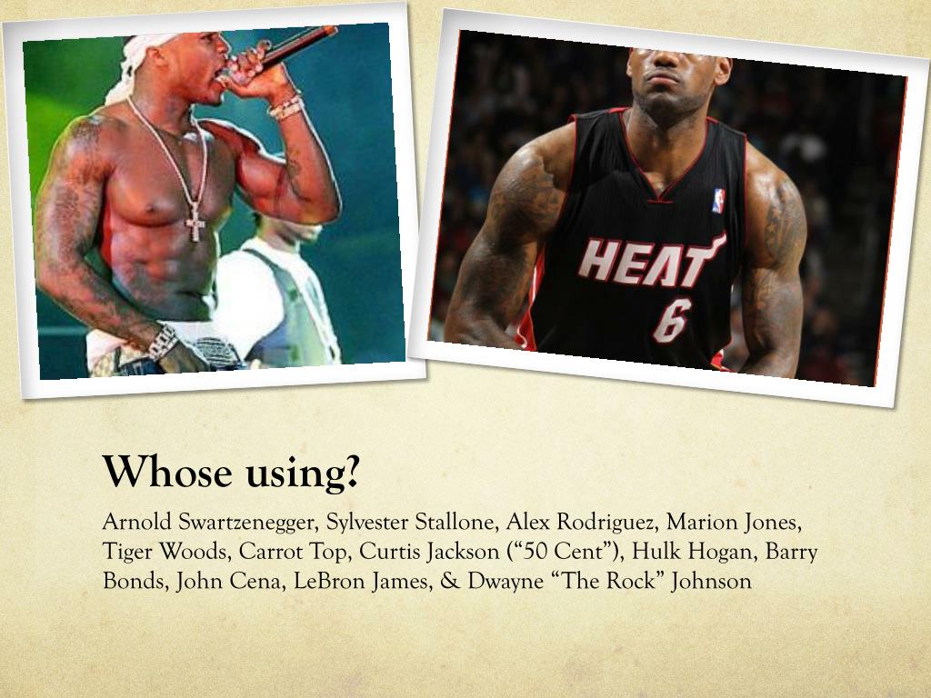 Whose using? Arnold Swartzenegger, Sylvester Stallone, Alex Rodriguez, Marion Jones, Tiger Woods, Carrot Top, Curtis Jackson (“50 Cent”), Hulk Hogan, Barry Bonds, John Cena, LeBron James, & Dwayne “The Rock” Johnson