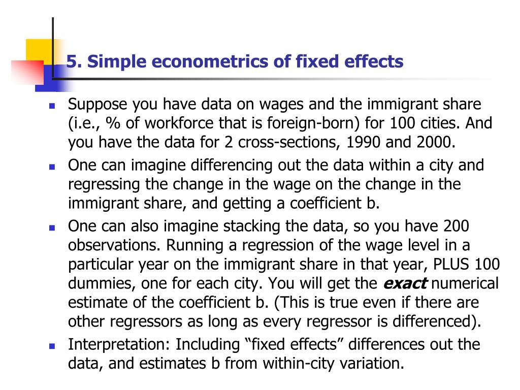 5. Simple econometrics of fixed effects • Suppose you have data on wages and the immigrant share (i.e., % of workforce that is foreign-born) for 100 cities. And you have the data for 2 cross-sections, 1990 and 2000. • One can imagine differencing out the data within a city and regressing the change in the wage on the change in the immigrant share, and getting a coefficient b. • One can also imagine stacking the data, so you have 200 observations. Running a regression of the wage level in a particular year on the immigrant share in that year, PLUS 100 dummies, one for each city. You will get the exact numerical estimate of the coefficient b. (This is true even if there are other regressors as long as every regressor is differenced). • Interpretation: Including “fixed effects” differences out the data, and estimates b from within-city variation.