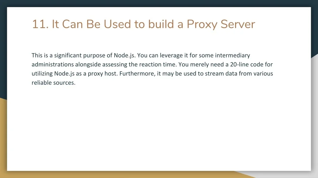 11. It Can Be Used to build a Proxy Server This is a significant purpose of Node.js. You can leverage it for some intermediary administrations alongside assessing the reaction time. You merely need a 20-line code for utilizing Node.js as a proxy host. Furthermore, it may be used to stream data from various reliable sources.
