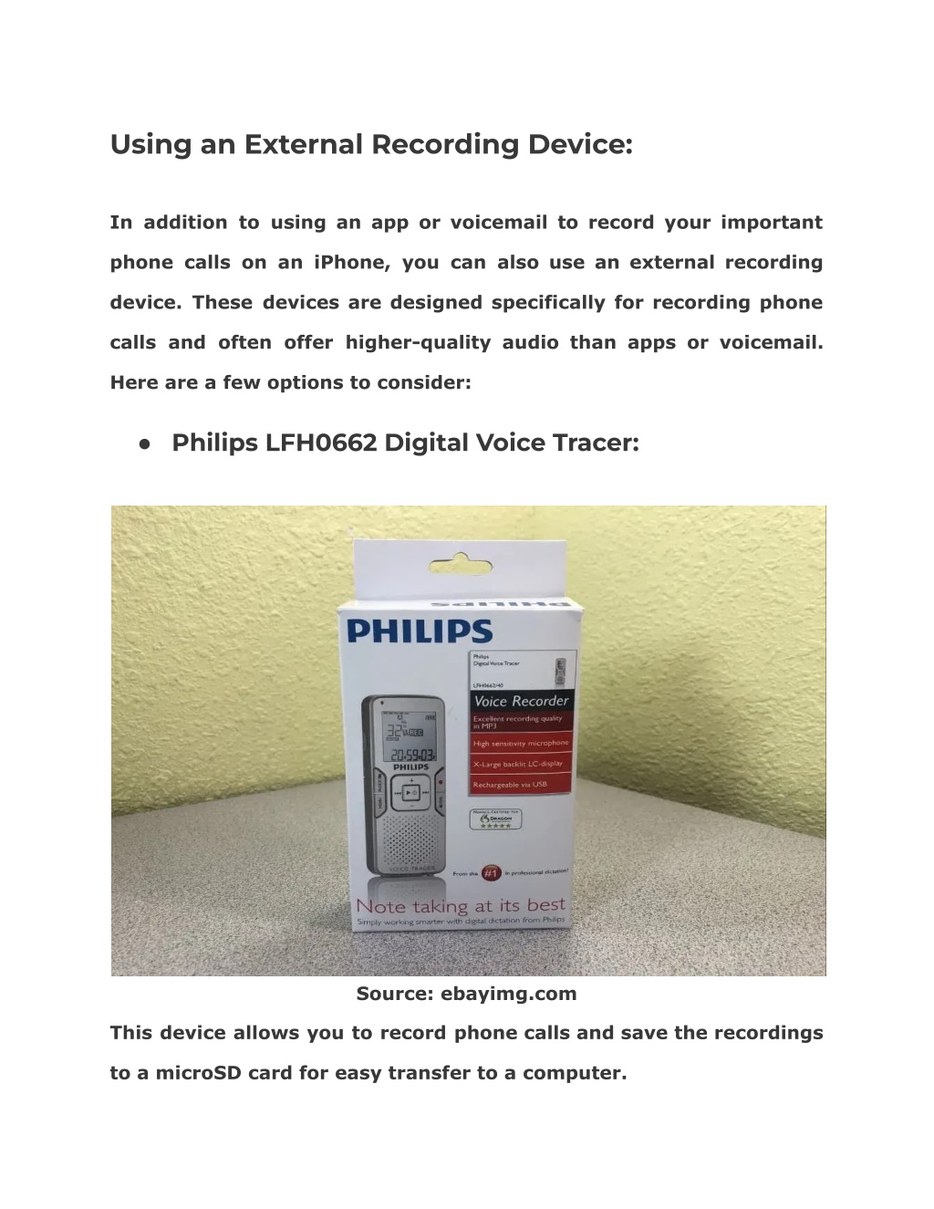 Using an External Recording Device: In addition to using an app or voicemail to record your important phone calls on an iPhone, you can also use an external recording device. These devices are designed specifically for recording phone calls and often offer higher-quality audio than apps or voicemail. Here are a few options to consider: ● Philips LFH0662 Digital Voice Tracer: Source: ebayimg.com This device allows you to record phone calls and save the recordings to a microSD card for easy transfer to a computer.