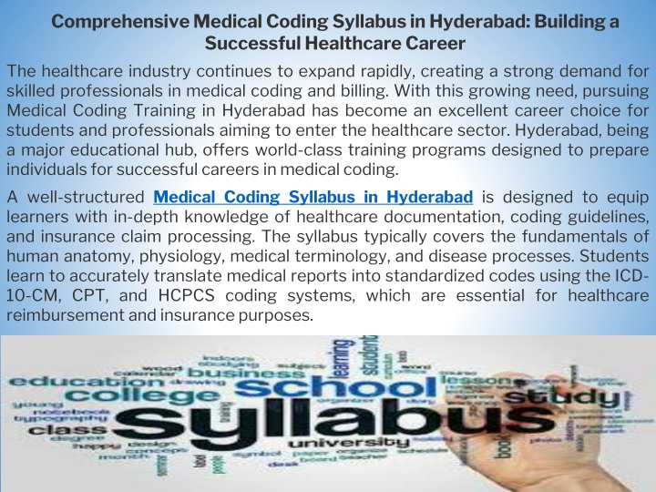 Comprehensive Medical Coding Syllabus in Hyderabad: Building a Successful Healthcare Career The healthcare industry continues to expand rapidly, creating a strong demand for skilled professionals in medical coding and billing. With this growing need, pursuing Medical Coding Training in Hyderabad has become an excellent career choice for students and professionals aiming to enter the healthcare sector. Hyderabad, being a major educational hub, offers world-class training programs designed to prepare individuals for successful careers in medical coding. A well-structured Medical Coding Syllabus in Hyderabad is designed to equip learners with in-depth knowledge of healthcare documentation, coding guidelines, and insurance claim processing. The syllabus typically covers the fundamentals of human anatomy, physiology, medical terminology, and disease processes. Students learn to accurately translate medical reports into standardized codes using the ICD-10-CM, CPT, and HCPCS coding systems, which are essential for healthcare reimbursement and insurance purposes.