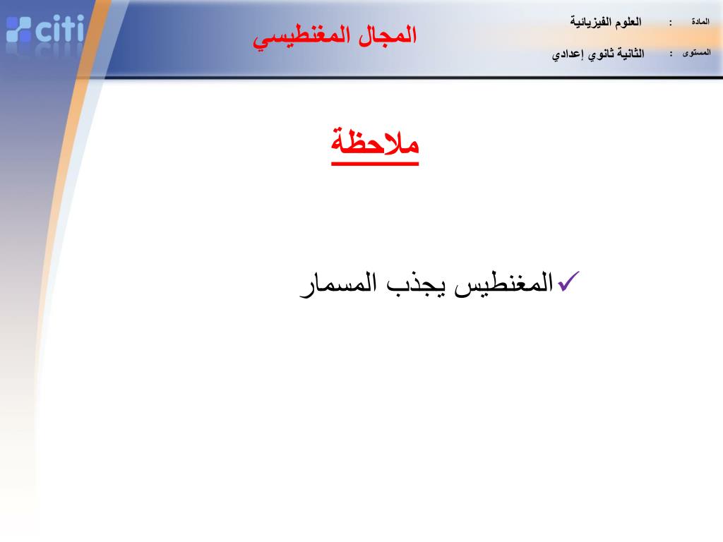 العلوم الفيزيائية المادة: المجال المغنطيسي الثانية ثانوي إعدادي المستوى: استنتاج • يوضح شكل برادة الحديد أن المغنطيس يحدث حوله مجال مغنطيسيا champ magnetique. • بتسبب في جذب المسمار.