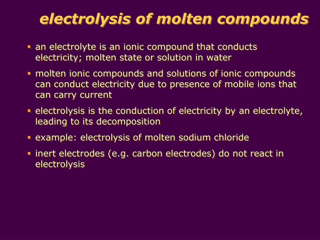 electrolysis of molten compounds • an electrolyte is an ionic compound that conducts electricity; molten state or solution in water • molten ionic compounds and solutions of ionic compounds can conduct electricity due to presence of mobile ions that can carry current • electrolysis is the conduction of electricity by an electrolyte, leading to its decomposition • example: electrolysis of molten sodium chloride • inert electrodes (e.g. carbon electrodes) do not react in electrolysis