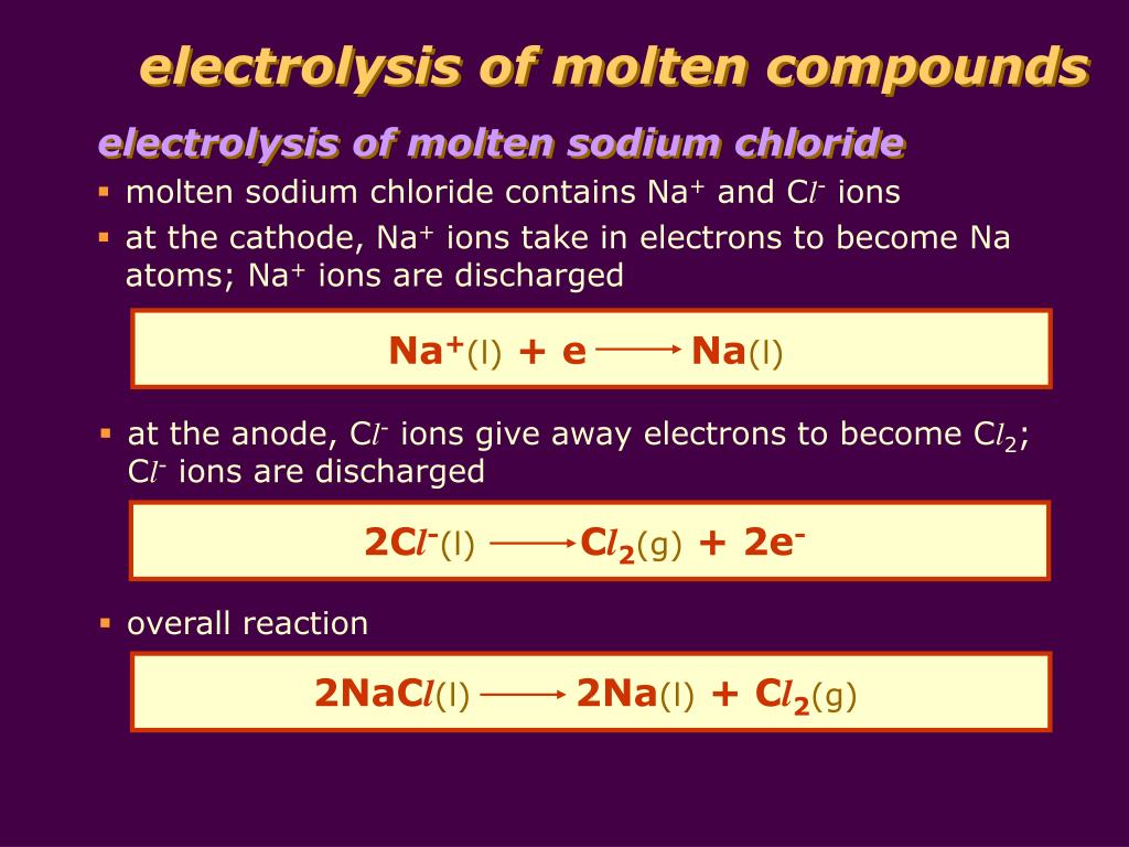 Na+(l) + e Na(l) electrolysis of molten compounds electrolysis of molten sodium chloride • molten sodium chloride contains Na+ and Cl- ions • at the cathode, Na+ ions take in electrons to become Na atoms; Na+ ions are discharged • at the anode, Cl- ions give away electrons to become Cl2; Cl- ions are discharged 2Cl-(l) Cl2(g) + 2e- • overall reaction 2NaCl(l) 2Na(l) + Cl2(g)