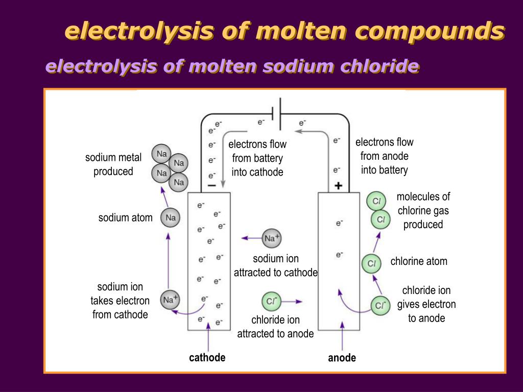 electrolysis of molten compounds electrolysis of molten sodium chloride electrons flow from anode into battery electrons flow from battery into cathode sodium metal produced molecules of chlorine gas produced sodium atom sodium ion attracted to cathode chlorine atom sodium ion takes electron from cathode chloride ion gives electron to anode chloride ion attracted to anode cathode anode