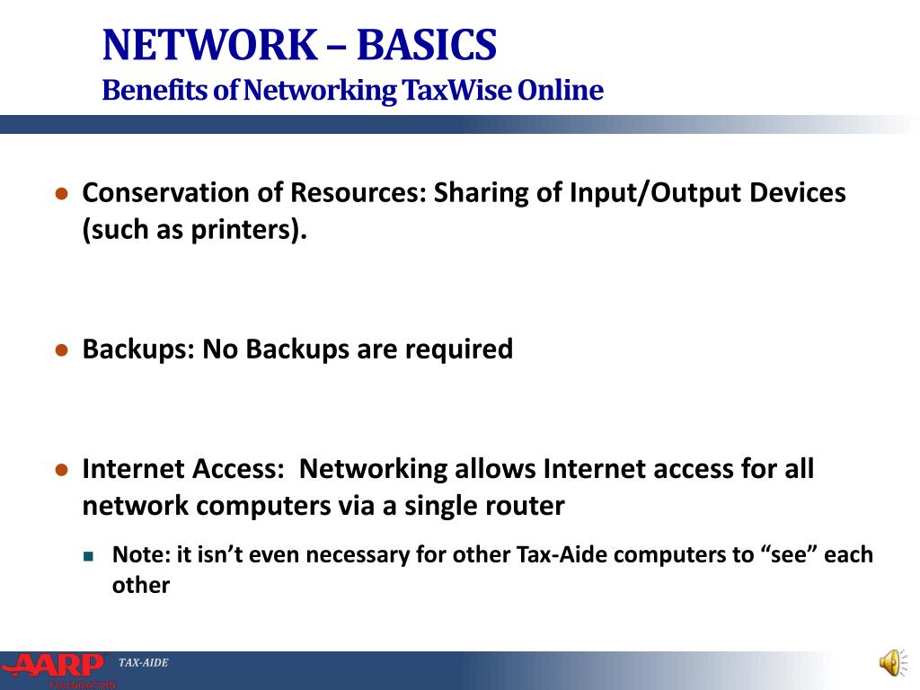 NETWORK – BASICSBenefits of Networking TaxWise Online • Conservation of Resources: Sharing of Input/Output Devices (such as printers). • Backups: No Backups are required • Internet Access: Networking allows Internet access for all network computers via a single router • Note: it isn’t even necessary for other Tax-Aide computers to “see” each other