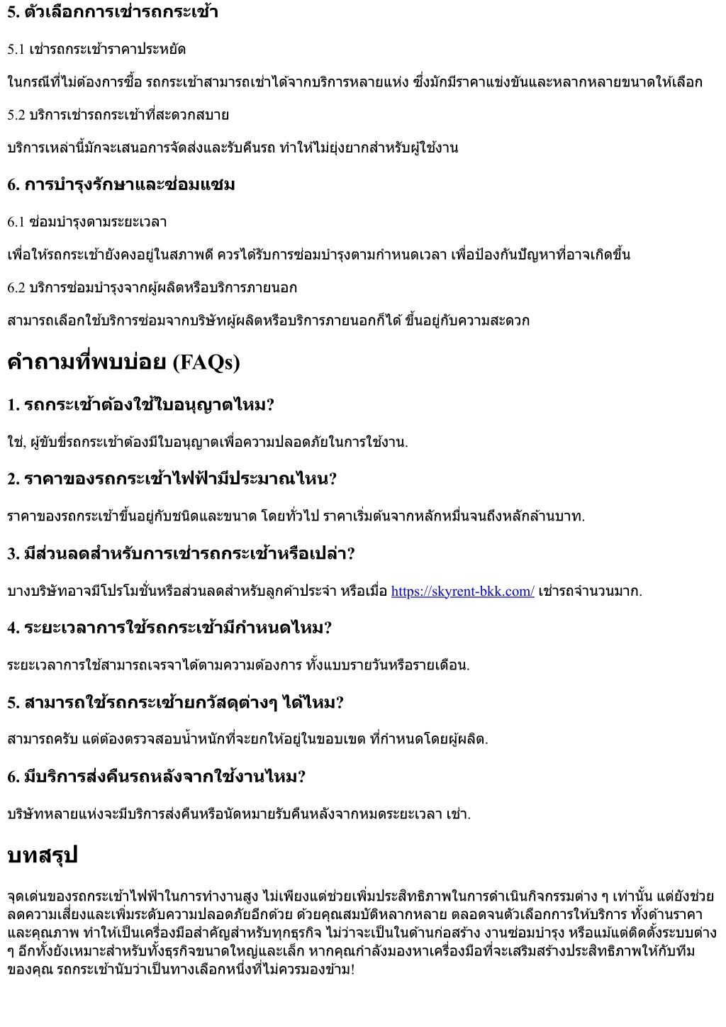 2. 5. ตัวเลือกการเช่ารถกระเช้า 5.1 เช่ารถกระเช้าราคาประหยัด ในกรณีที?ไม่ต้องการซื?อรถกระเช้าสามารถเช่าได้จากบริการหลายแห่งซึ?งมักมีราคาแข่งขันและหลากหลายขนาดให้เลือก 5.2 บริการเช่ารถกระเช้าที?สะดวกสบาย บริการเหล่านี?มักจะเสนอการจัดส่งและรับคืนรถทําให้ไม่ยุ่งยากสําหรับผู้ใช้งาน 6. การบํารุงรักษาและซ่อมแซม 6.1 ซ่อมบํารุงตามระยะเวลา เพื?อให้รถกระเช้ายังคงอยู่ในสภาพดีควรได้รับการซ่อมบํารุงตามกําหนดเวลาเพื?อป้องกันปัญหาที?อาจเกิดขึ?น 6.2 บริการซ่อมบํารุงจากผู้ผลิตหรือบริการภายนอก สามารถเลือกใช้บริการซ่อมจากบริษัทผู้ผลิตหรือบริการภายนอกก็ได้ขึ?นอยู่กับความสะดวก คําถามที?พบบ่อย (FAQs) 1. รถกระเช้าต้องใช้ใบอนุญาตไหม? ใช่, ผู้ขับขี?รถกระเช้าต้องมีใบอนุญาตเพื?อความปลอดภัยในการใช้งาน. 2. ราคาของรถกระเช้าไฟฟ ้ ามีประมาณไหน? ราคาของรถกระเช้าขึ?นอยู่กับชนิดและขนาดโดยทั?วไปราคาเริ?มต้นจากหลักหมื?นจนถึงหลักล้านบาท. 3. มีส่วนลดสําหรับการเช่ารถกระเช้าหรือเปล่า? บางบริษัทอาจมีโปรโมชั?นหรือส่วนลดสําหรับลูกค้าประจําหรือเมื?อhttps://skyrent-bkk.com/เช่ารถจํานวนมาก. 4. ระยะเวลาการใช้รถกระเช้ามีกําหนดไหม? ระยะเวลาการใช้สามารถเจรจาได้ตามความต้องการทั?งแบบรายวันหรือรายเดือน. 5. สามารถใช้รถกระเซ้ายกวัสดุต่างๆได้ไหม? สามารถครับแต่ต้องตรวจสอบนํ?าหนักที?จะยกให้อยู่ในขอบเขตที?กําหนดโดยผู้ผลิต. 6. มีบริการส่งคืนรถหลังจากใช้งานไหม? บริษัทหลายแห่งจะมีบริการส่งคืนหรือนัดหมายรับคืนหลังจากหมดระยะเวลาเช่า. บทสรุป จุดเด่นของรถกระเช้าไฟฟ้าในการทํางานสูงไม่เพียงแต่ช่วยเพิ?มประสิทธิภาพในการดําเนินกิจกรรมต่างๆเท่านั?นแต่ยังช่วย ลดความเสี?ยงและเพิ?มระดับความปลอดภัยอีกด้วยด้วยคุณสมบัติหลากหลายตลอดจนตัวเลือกการให้บริการทั?งด้านราคา และคุณภาพทําให้เป็นเครื?องมือสําคัญสําหรับทุกธุรกิจไม่ว่าจะเป็นในด้านก่อสร้างงานซ่อมบํารุงหรือแม้แต่ติดตั?งระบบต่าง ๆอีกทั?งยังเหมาะสําหรับทั?งธุรกิจขนาดใหญ่และเล็กหากคุณกําลังมองหาเครื?องมือที?จะเสริมสร้างประสิทธิภาพให้กับทีม ของคุณรถกระเช้านับว่าเป็นทางเลือกหนึ?งที?ไม่ควรมองข้าม!