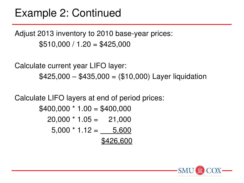 Example 2: Continued Adjust 2013 inventory to 2010 base-year prices: $510,000 / 1.20 = $425,000 Calculate current year LIFO layer: $425,000 – $435,000 = ($10,000) Layer liquidation Calculate LIFO layers at end of period prices: $400,000 * 1.00 = $400,000 20,000 * 1.05 = 21,000 5,000 * 1.12 = 5,600 $426,600