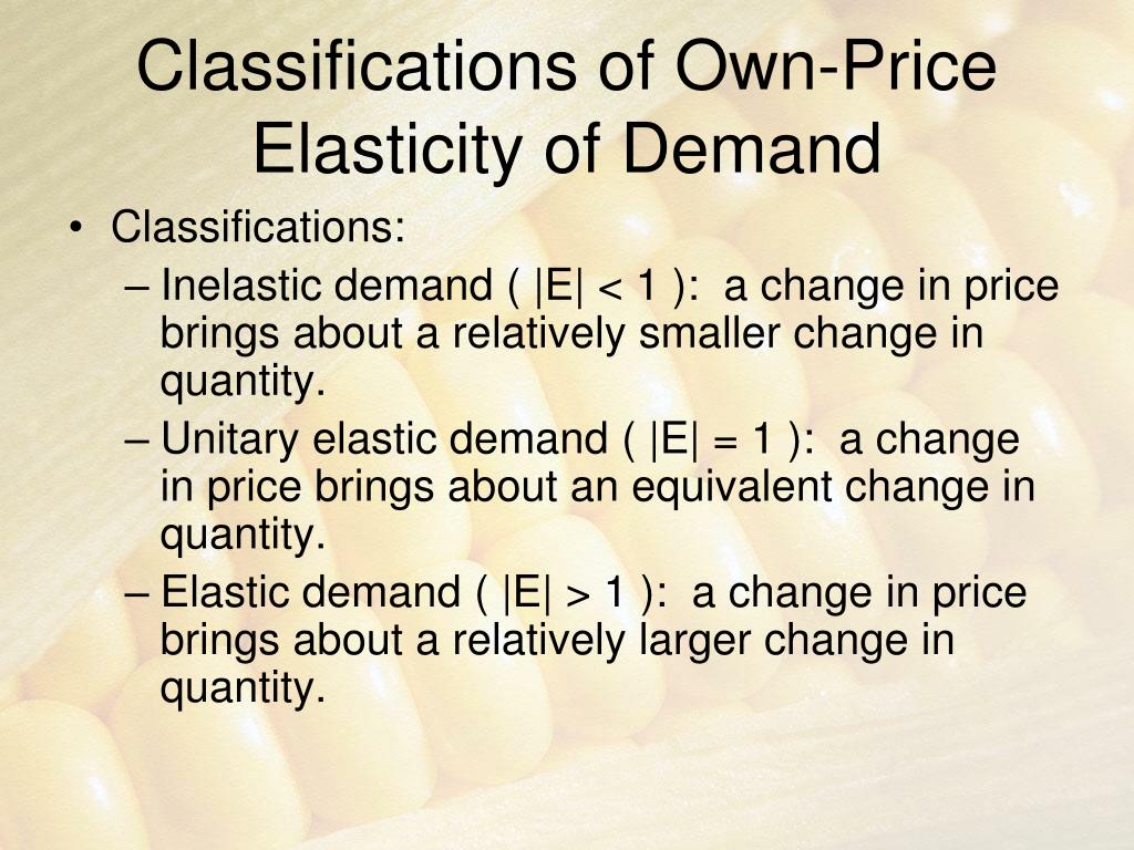 Classifications of Own-Price Elasticity of Demand • Classifications: • Inelastic demand ( |E| < 1 ): a change in price brings about a relatively smaller change in quantity. • Unitary elastic demand ( |E| = 1 ): a change in price brings about an equivalent change in quantity. • Elastic demand ( |E| > 1 ): a change in price brings about a relatively larger change in quantity.