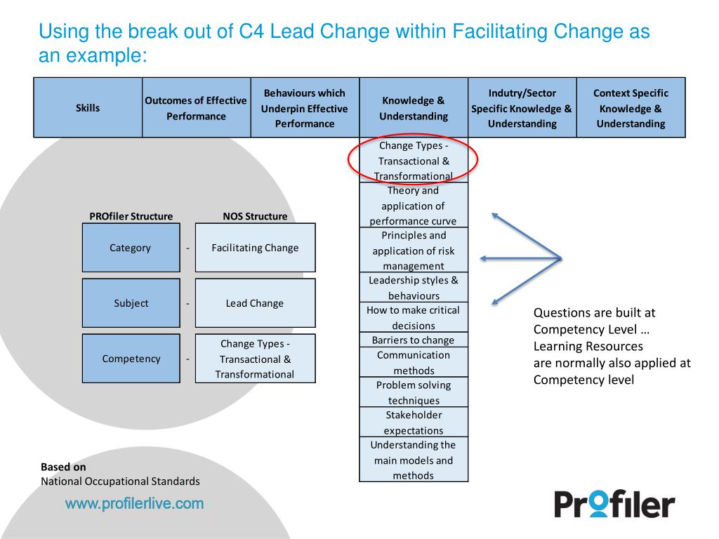 Using the break out of C4 Lead Change within Facilitating Change as an example: Questions are built at Competency Level … Learning Resources are normally also applied at Competency level Based on National Occupational Standards