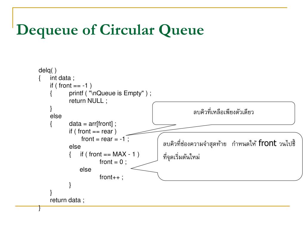 Dequeue of Circular Queue delq( ) { int data ; if ( front == -1 ) { printf ( "\nQueue is Empty" ) ; return NULL ; } else { data = arr[front] ; if ( front == rear ) front = rear = -1 ; else { if ( front == MAX - 1 ) front = 0 ; else front++ ; } } return data ; } ลบคิวที่เหลือเพียงตัวเดียว ลบคิวที่ช่องความจำสุดท้าย กำหนดให้ front วนไปชี้ที่จุดเริ่มต้นใหม่