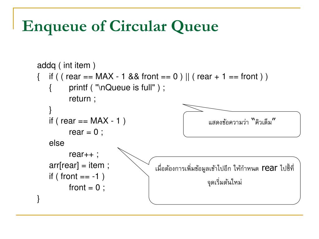 Enqueue of Circular Queue addq ( int item ) { if ( ( rear == MAX - 1 && front == 0 ) || ( rear + 1 == front ) ) { printf ( "\nQueue is full" ) ; return ; } if ( rear == MAX - 1 ) rear = 0 ; else rear++ ; arr[rear] = item ; if ( front == -1 ) front = 0 ; } แสดงข้อความว่า “คิวเต็ม” เมื่อต้องการเพิ่มข้อมูลเข้าไปอีก ให้กำหนด rear ไปชี้ที่จุดเริ่มต้นใหม่