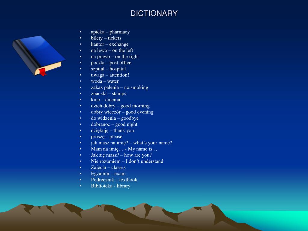 DICTIONARY • apteka – pharmacy • bilety – tickets • kantor – exchange • na lewo – on the left • na prawo – on the right • poczta – post office • szpital – hospital • uwaga – attention! • woda – water • zakaz palenia – no smoking • znaczki – stamps • kino – cinema • dzień dobry – good morning • dobry wieczór – good evening • do widzenia – goodbye • dobranoc – good night • dziękuję – thank you • proszę – please • jak masz na imię? – what’s your name? • Mam na imię… - My name is… • Jak się masz? – how are you? • Nie rozumiem – I don’t understand • Zajęcia – classes • Egzamin – exam • Podręcznik – textbook • Biblioteka - library