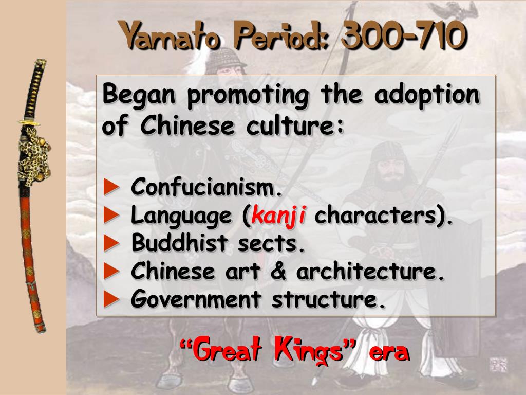 Yamato Period: 300-710 Began promoting the adoption of Chinese culture: • Confucianism. • Language (kanji characters). • Buddhist sects. • Chinese art & architecture. • Government structure. “Great Kings” era