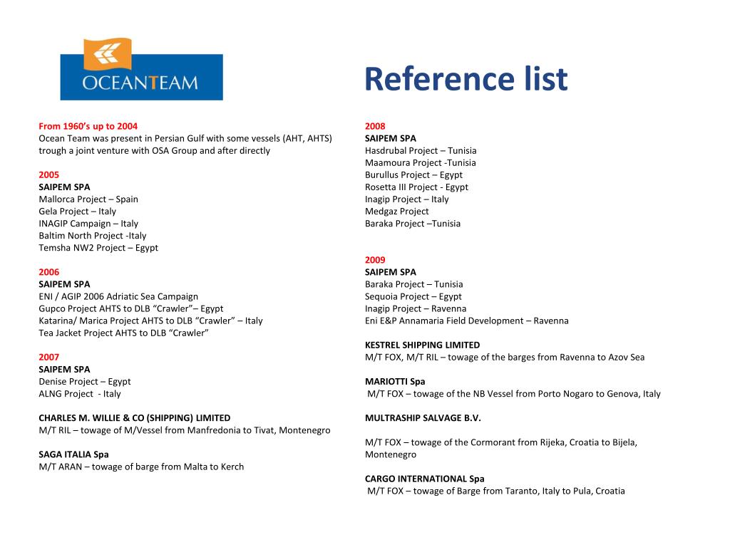 Reference list From 1960’s up to 2004 Ocean Team was present in Persian Gulf with some vessels (AHT, AHTS) trough a joint venture with OSA Group and after directly 2005 SAIPEM SPA Mallorca Project – Spain Gela Project – Italy INAGIP Campaign – Italy Baltim North Project -Italy Temsha NW2 Project – Egypt 2006 SAIPEM SPA ENI / AGIP 2006 Adriatic Sea Campaign Gupco Project AHTS to DLB “Crawler”– Egypt Katarina/ Marica Project AHTS to DLB “Crawler” – Italy Tea Jacket Project AHTS to DLB “Crawler” 2007 SAIPEM SPA Denise Project – Egypt ALNG Project - Italy CHARLES M. WILLIE & CO (SHIPPING) LIMITED M/T RIL – towage of M/Vessel from Manfredonia to Tivat, Montenegro SAGA ITALIA Spa M/T ARAN – towage of barge from Malta to Kerch 2008 SAIPEM SPA Hasdrubal Project – Tunisia Maamoura Project -Tunisia Burullus Project – Egypt Rosetta III Project - Egypt Inagip Project – Italy Medgaz Project Baraka Project –Tunisia 2009 SAIPEM SPA Baraka Project – Tunisia Sequoia Project – Egypt Inagip Project – Ravenna Eni E&P Annamaria Field Development – Ravenna KESTREL SHIPPING LIMITED M/T FOX, M/T RIL – towage of the barges from Ravenna to Azov Sea MARIOTTI Spa M/T FOX – towage of the NB Vessel from Porto Nogaro to Genova, Italy MULTRASHIP SALVAGE B.V. M/T FOX – towage of the Cormorant from Rijeka, Croatia to Bijela, Montenegro CARGO INTERNATIONAL Spa M/T FOX – towage of Barge from Taranto, Italy to Pula, Croatia