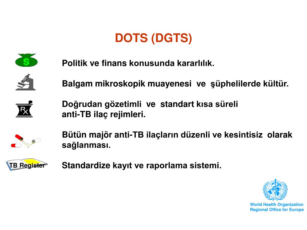 TB Register World Health Organization Regional Office for Europe DOTS (DGTS) • Politikve finanskonusunda kararlılık. • Balgam mikroskopik muayenesi veşüphelilerde kültür. • Doğrudan gözetimli ve standart kısa sürelianti-TB ilaç rejimleri. • Bütün majör anti-TB ilaçların düzenli ve kesintisiz olaraksağlanması. • Standardize kayıt ve raporlama sistemi.