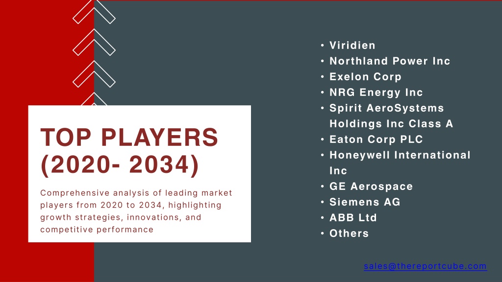 5. sales@thereportcube.com • Viridien • Northland Power Inc • Exelon Corp • NRG Energy Inc • Spirit AeroSystems Holdings Inc Class A • Eaton Corp PLC • Honeywell International Inc • GE Aerospace • Siemens AG • ABB Ltd • Others • TOP PLAYERS • (2020- 2034) • Comprehensive analysis of leading market players from 2020 to 2034, highlighting growth strategies, innovations, and competitive performance