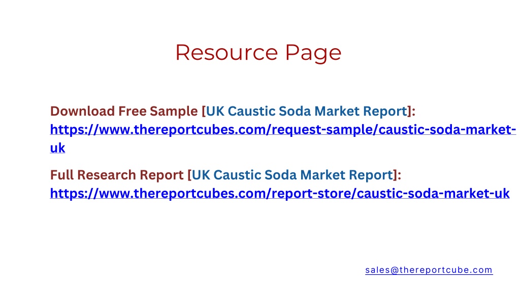 7. sales@thereportcube.com • Resource Page Download Free Sample [UK Caustic Soda Market Report]: https://www.thereportcubes.com/request-sample/caustic-soda-market-uk Full Research Report [UK Caustic Soda Market Report]: https://www.thereportcubes.com/report-store/caustic-soda-market-uk