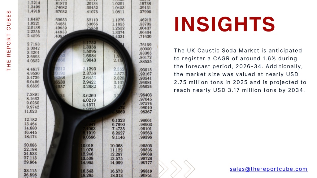 2. sales@thereportcube.com • INSIGHTS • The UK Caustic Soda Market is anticipated to register a CAGR of around 1.6% during the forecast period, 2026-34. Additionally, the market size was valued at nearly USD 2.75 million tons in 2025 and is projected to reach nearly USD 3.17 million tons by 2034. • THE REPORT CUBES