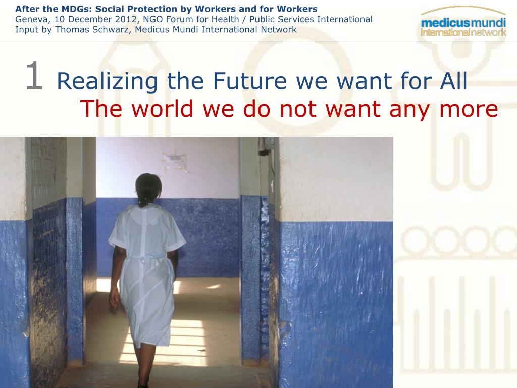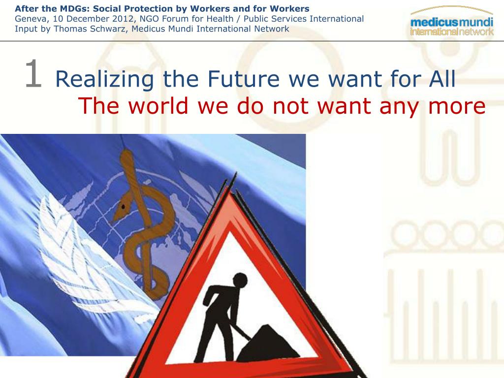 After the MDGs: Social Protection by Workers and for WorkersGeneva, 10 December 2012, NGO Forum for Health / Public Services InternationalInput by Thomas Schwarz, Medicus Mundi International Network 1 Realizing the Future we want for All The world we do not want any more ?
