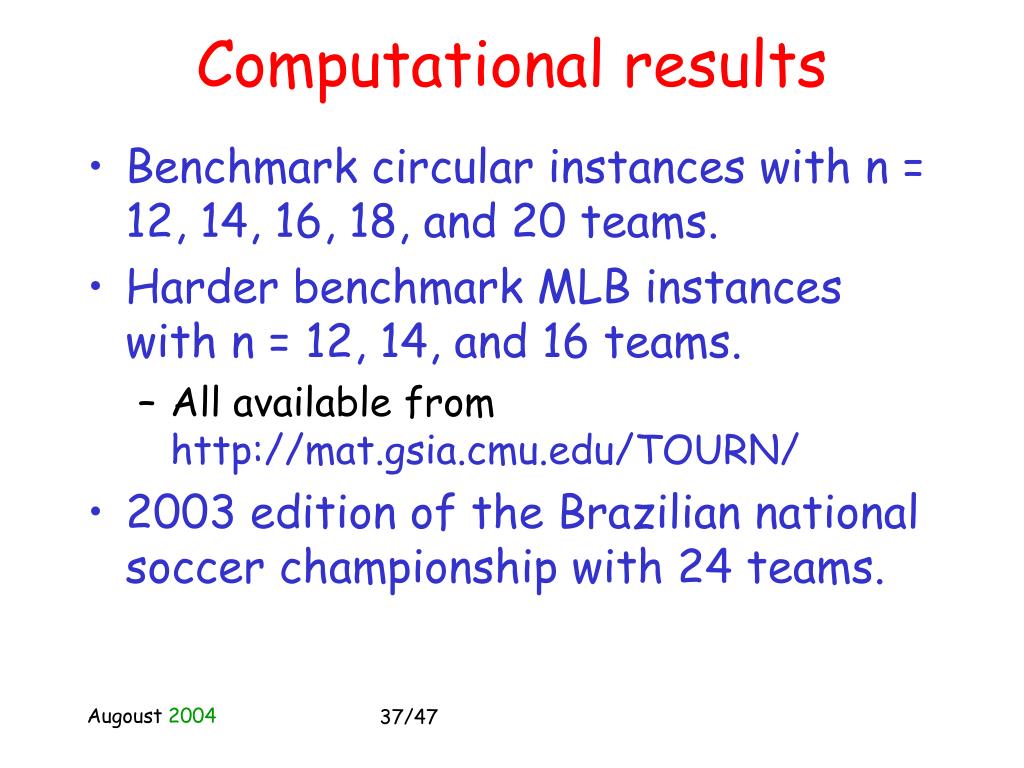 Computational results • Benchmark circular instances with n = 12, 14, 16, 18, and 20 teams. • Harder benchmark MLB instances with n = 12, 14, and 16 teams. • All available from http://mat.gsia.cmu.edu/TOURN/ • 2003 edition of the Brazilian national soccer championship with 24 teams.