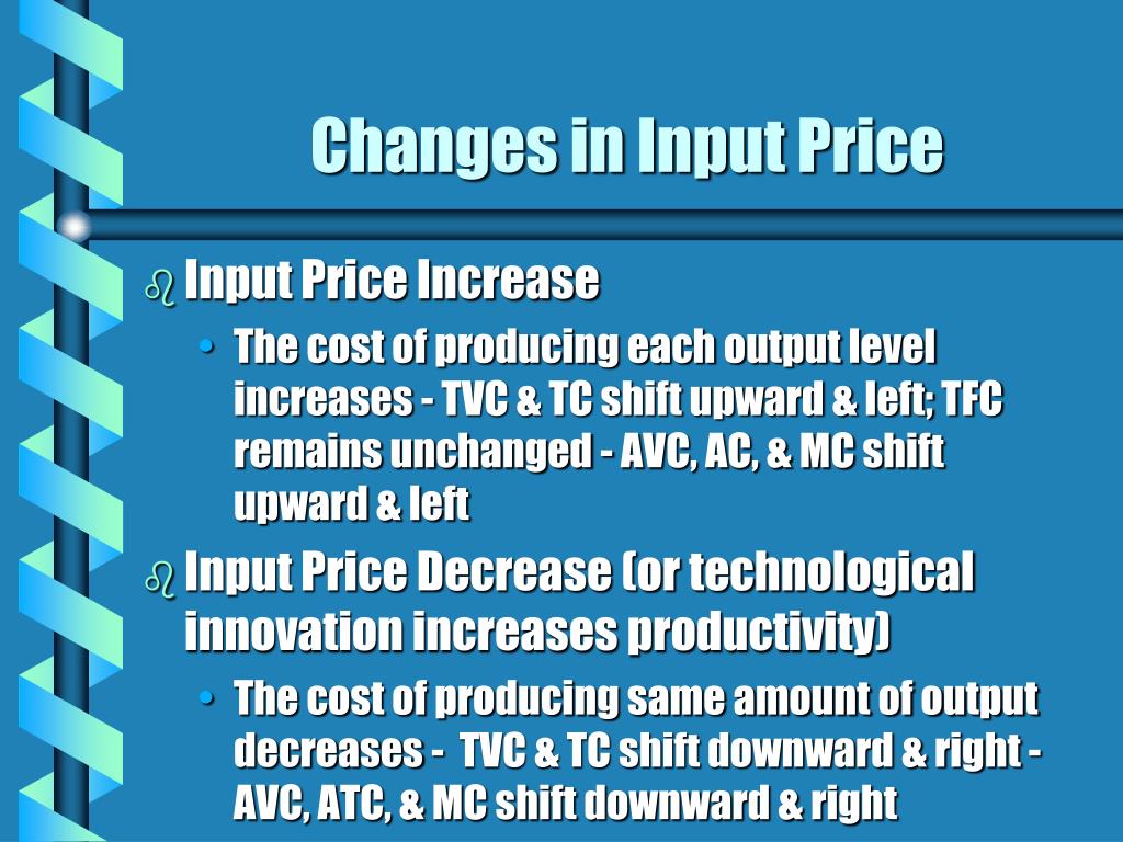 Changes in Input Price • Input Price Increase • The cost of producing each output level increases - TVC & TC shift upward & left; TFC remains unchanged - AVC, AC, & MC shift upward & left • Input Price Decrease (or technological innovation increases productivity) • The cost of producing same amount of output decreases - TVC & TC shift downward & right - AVC, ATC, & MC shift downward & right