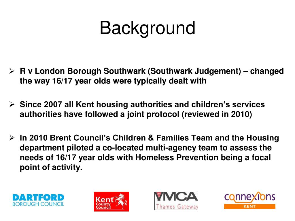 Background • R v London Borough Southwark (Southwark Judgement) – changed the way 16/17 year olds were typically dealt with • Since 2007 all Kent housing authorities and children’s services authorities have followed a joint protocol (reviewed in 2010) • In 2010 Brent Council’s Children & Families Team and the Housing department piloted a co-located multi-agency team to assess the needs of 16/17 year olds with Homeless Prevention being a focal point of activity.